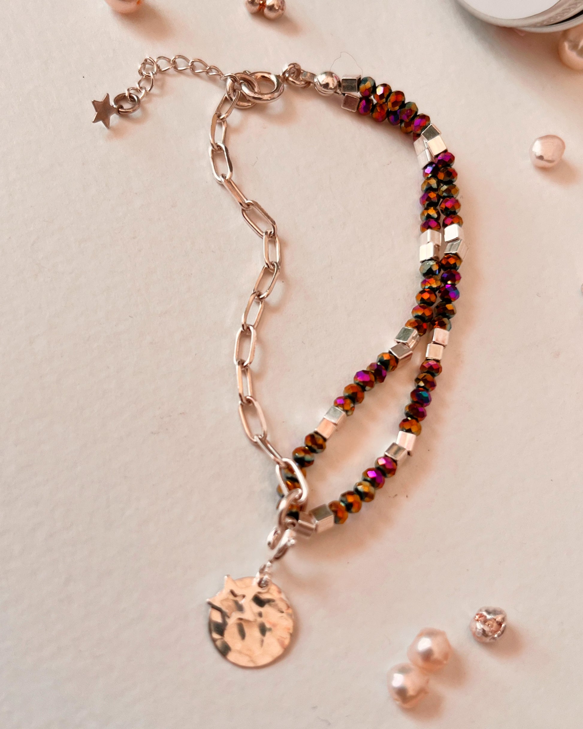 Esta pulsera combina elegancia y diversión con su diseño de eslabones de plata 925 y cristal tornasolado. La mostacilla cuadrada de plata y el dije de medalla y estrella le dan un toque único . Una joya perfecta para cualquier ocasión.